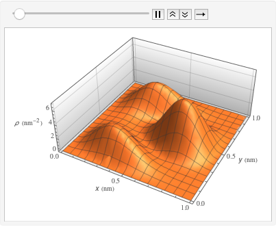 Calculez la densité de probabilité en insérant les valeurs de la constante de Planck réduite, de la masse des électrons et d'une boîte de taille atomique, en utilisant les unités de masse des électrons, les nanomètres et les femtosecondes.