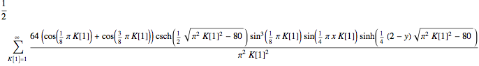 (sol = DSolveValue[{heqn, bc}, u[x, y], {x, y}]) // TraditionalFormOut[3]//TraditionalForm=