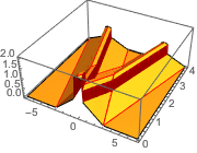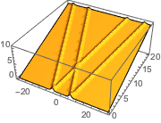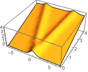 Plot3D[%, {x, -7, 7}, {t, 0, 4}, Mesh -> None]Out[4]=