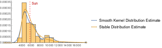 Partition[stars, 100]];温度の記述統計量をいくつか計算する.