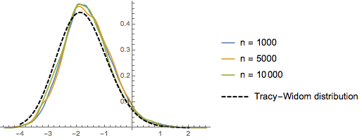 RandomSample[Range[n]]]], {2000}] - 2.0 Sqrt[n]);Comparez l'histogramme lisse de longueurs d'échelle échantillonnées pour augmenter les dimensions avec la fonction de densité de probabilité de la loi de Tracy–Widom.