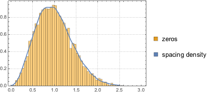 Нули дзета-функции Римана предположительно относятся к собственным значениям эрмитовых операторов и матриц. Сравните нормализованное дистанционирование нулей с нормализованным дистанционированием массы собственных значений отобранных примеров из GaussianUnitaryMatrixDistribution.