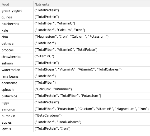 "TotalFolate"}}, {"strawberries", {"VitaminC"}}, {"salmon", \