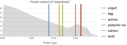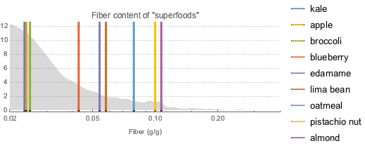 食物繊維に富むことで有名なスーパーフードを求め,およそ9000種類の他の食品と比較し,平滑化ヒストグラムとして可視化する.灰色の曲線はほとんどの食品の食物繊維の確率密度関数を表している.