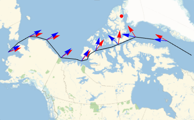 Comece com uma lista de pares de latitude e longitude descrevendo a Passagem do Noroeste e obtenha a posição do norte geomagnético.