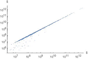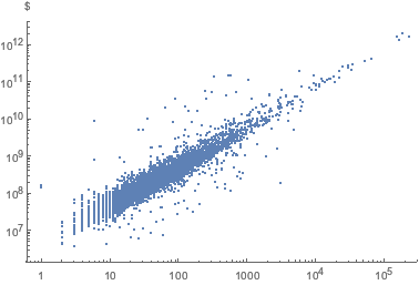ListLogLogPlot[empVsAssets, AxesLabel -> Automatic]Out[8]=