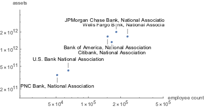 "FDICInstitution", {"TotalEmployeeNumber", "TotalAssets"}];In[8]:=