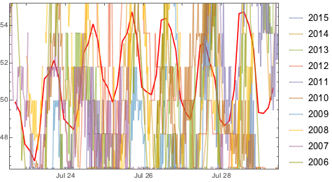 지난 10년간의 주간 평균 기온을 가져와 그 이전 10년과 비교합니다.