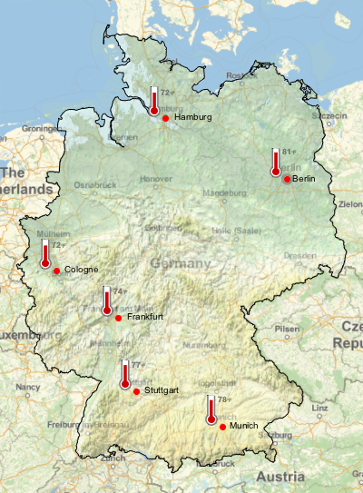 독일의 6개 대도시의 목록을 작성하고 각 도시의 오늘의 최고 기온의 예측을 얻습니다.
