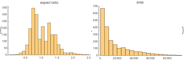 Faça um histograma das proporções e áreas das pinturas. Nos intervalos padrão de largura, a distribuição de proporções de aspecto parece ser trimodal.
