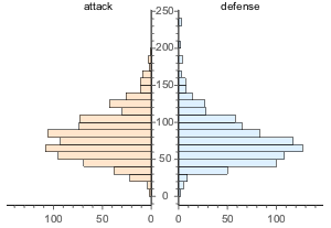 PairedHistogram[EntityValue["Pokemon", "Attack"],