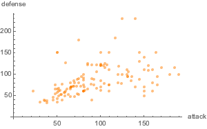 Wolfram Knowledgebase 中包含了关于流行文化偶像以及科学知识等信息. 这里我们通过内置实体框架,对收藏的口袋妖怪的体格特征(攻击和防御值、体重、颜色)进行了研究、对比和可视化.