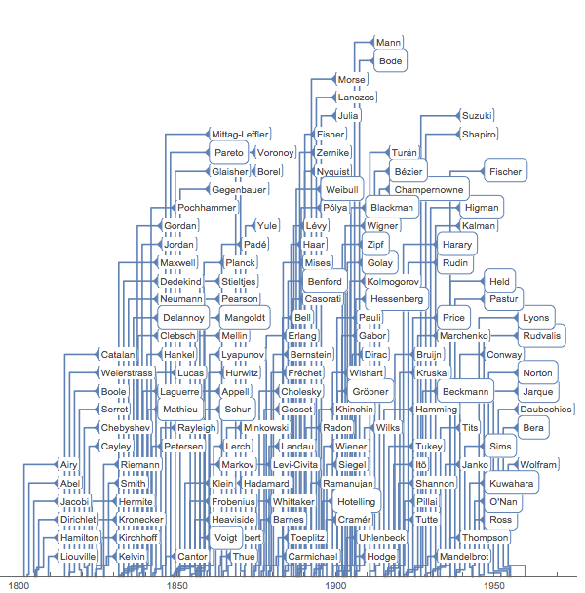 Wolfram 语言和 Wolfram knowledgebase 的关系构造可以用几种有趣方法进行可视化. 在该范例中,你可以创建体现该关系的词汇云、计算性探索并收集资料的输入,以及可视化作为 Wolfram 语言符号一部分使用的人物姓名的相关地点和时间.