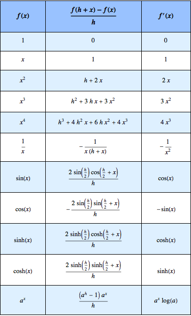 fList = {1, x, x^2, x^3, x^4, 1/x, Sin[x], Cos[x], Sinh[x], Cosh[x], a^(x)}; dqList = DifferenceQuotient[fList, {x, h}]; derList = Limit[dqList, h -> 0];