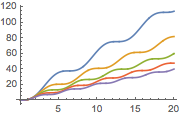 Plot[Table[sol, {\[Lambda], 1, 3, 0.5}] // Evaluate, {x, 0, 20}]Out[3]=