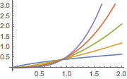 Plot[Table[sol, {a, 1, 4, 0.7}] // Evaluate, {x, 0, 2}]Out[6]=