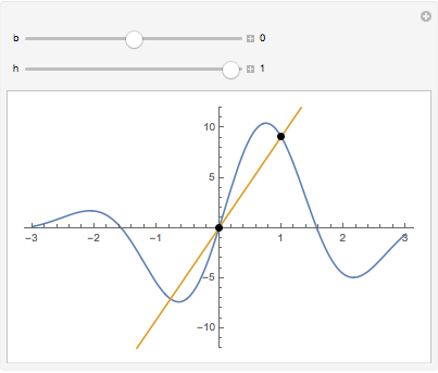 f[b] + (DifferenceQuotient[f[x], {x, h}] /. (x -> b)) (x - b);Visualisez les variations de la droite sécante lorsque le point de base est déplacé, mais à chaque point de base, elle se rapproche de la tangente en tant que