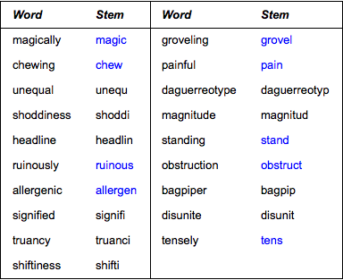バージョン11には,単語の語幹を求め,複数語尾や屈折語尾等を削除する新たなツールが含まれている.単語の語幹はもとの意味を有しているが,それ自体は辞書に含まれないことが多い.この例では,その両方の場合を示す.