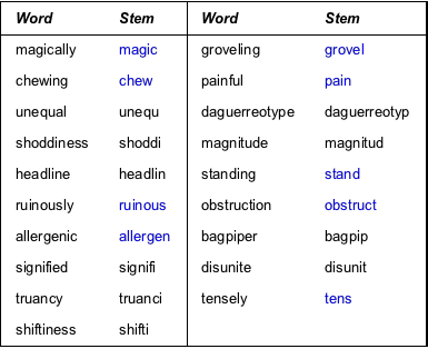 Версия 11 включает в себя новые инструменты для поиска основ слов, избавления от множественного числа, склонения и т.д. Основа слова всё также несёт в себе значение изначального слова, но чаще всего сама по себе не является словом из словаря.