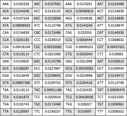 frequencies = N[Counts[codons]/Length[codons]];由 A、C、G、T 核甘酸构成 64 个可能的密码子,并都在所选基因中出现.