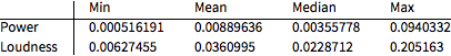 TableHeadings -> {{"Power", "Loudness"}, {"Min", "Mean", "Median",