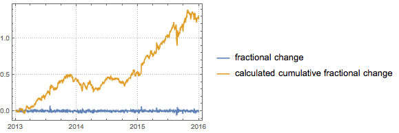 fun := (Exp[Accumulate[Log[# + 1]]] - 1) &주가 시계열에 누적 가격 변화율을 적용합니다.