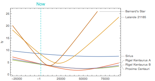 Dado que la distancia entre la Tierra y el Sol es muy pequeña cuando se compara con las otras estrellas, la serie temporal para el Sol no refleja su movimiento propio y será excluido. La mayoría de las otras estrellas se mantienen en una distancia casi constante a la Tierra y al Sol, pero hay dos que se acercarán y luego se alejarán.
