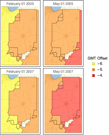 GeoGraphics[{Orange, Polygon[Entity["TimeZone", "Europe/London"]]}]インディアナ州のさまざまな地域における2つの日付間のオフセットの違いを比較する.