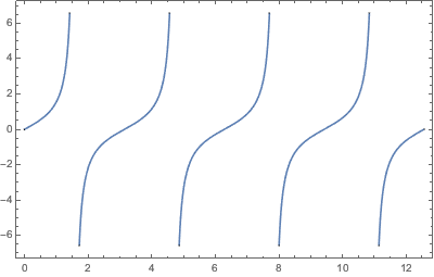 Plot[Tan[x], {x, 0, 4 Pi}, ImageSize -> 400, PlotTheme -> "Frame"]Out[2]=