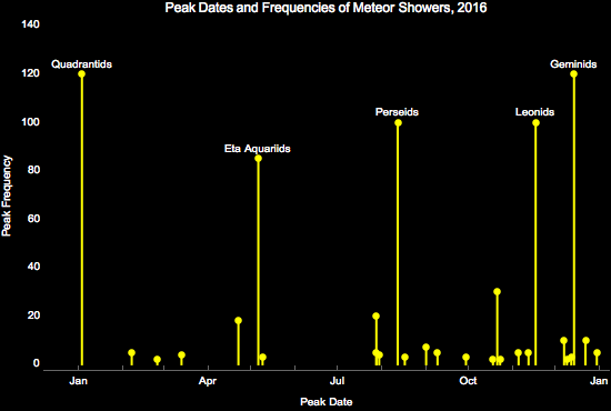 PlotLabel -> "Peak Dates and Frequencies of Meteor Showers, 2016",