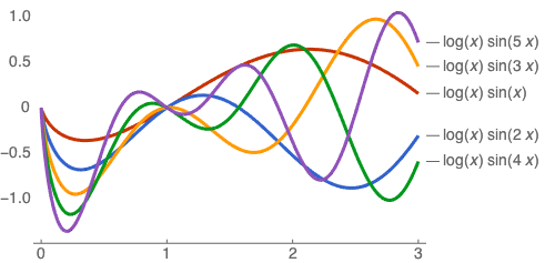 Plot[Evaluate[Table[Log[x] Sin[i x], {i, 1, 5}]], {x, 0, 3},