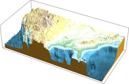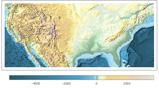 Данные о высоте над уровнем моря для граничащих с континентальными США регионов выдаётся в метрах, колеблясь от 5700 метров на глубине океана до 3700 метров в Скалистых горах.