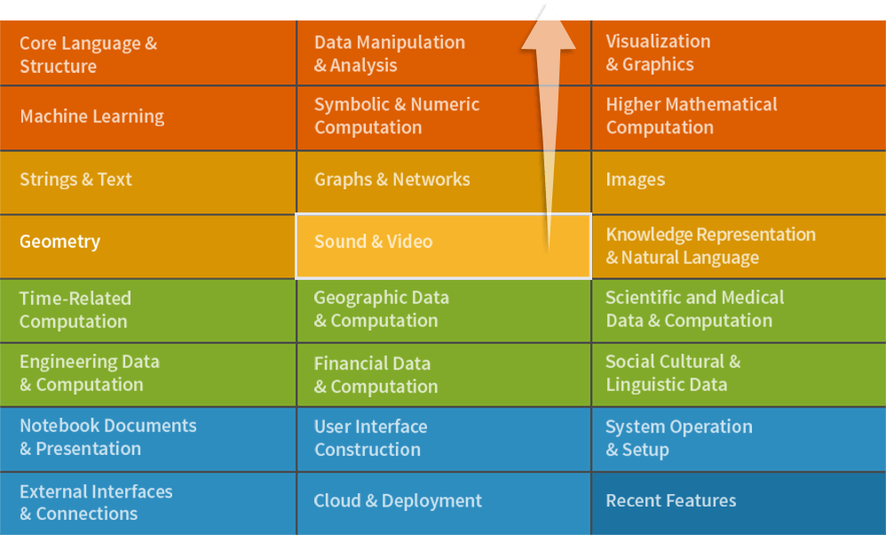 Wolfram Computación de audio es una parte integrada de Wolfram Language. El sistema completo contiene más de 6000 funciones incorporadas que abarcan todas las áreas de la computación, todas cuidadosamente integradas de manera que trabajen perfectamente en conjunto.