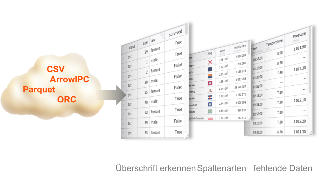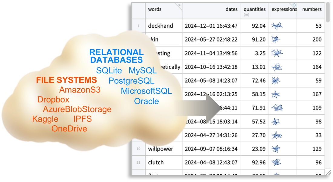 Importieren Sie spaltenbasierte Speicherformate wie Parquet und ORC. Erkennen Sie automatisch Überschriften und verstehen Sie die Struktur von CSV und anderen Formaten. Erhalten Sie Daten direkt als integrierte berechenbare Entitäten aus der Wolfram Knowledgebase.