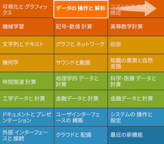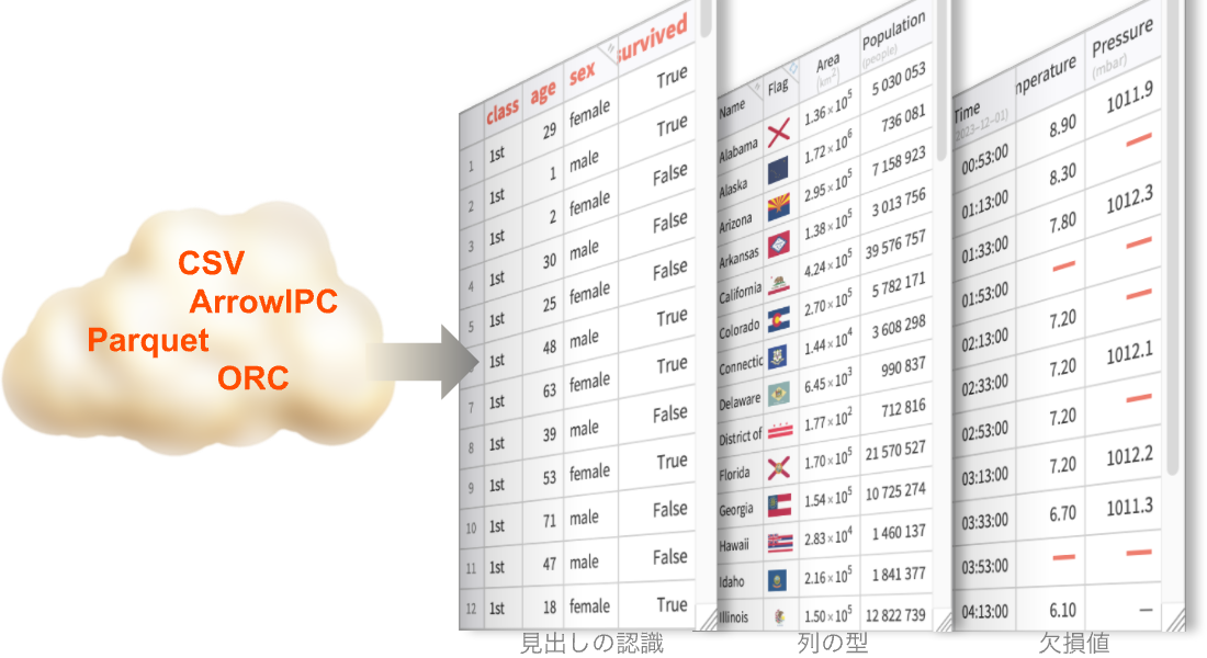 ParquetやORC等のカラム型ストレージ形式をインポートします.自動的にCSV形式等の見出しを検出し,データ構造を理解します.Wolfram Knowledgebaseからは,計算可能な組込みの実体としてデータを直接取得することができます.