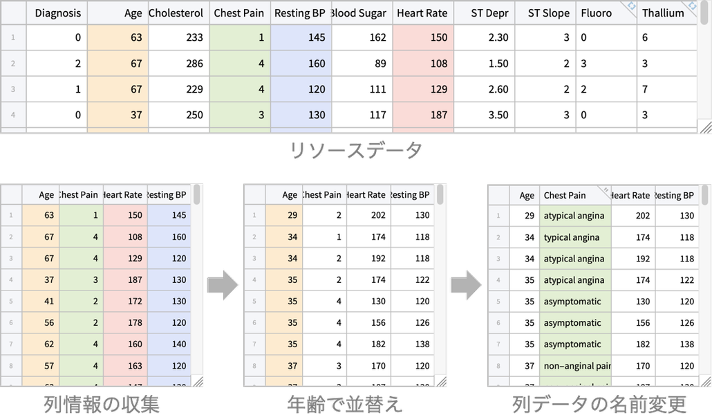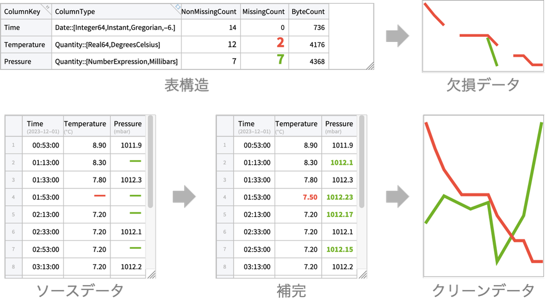 統計手法や機械学習を適用して,欠損値の補完や異常値の検出を行います.欠損値や外れ値を一貫して管理することで,自動列変換やデータ整形ツールを使った再現可能な分析を実現します.