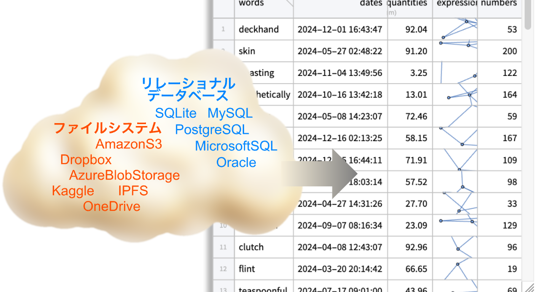 リレーショナルデータベース,またはAmazon S3,Azure Blob等のクラウドストレージにあるビッグデータにアクセスできます.表形式の関数は,アウトオブコアデータともシームレスに連携します.