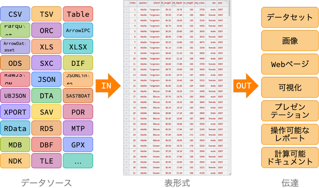 列指向データ構造の簡単なインポート,複雑なデータ型の効率的な表現,そして強力な分析機能により,データサイエンスのワークフローをスムーズにします.