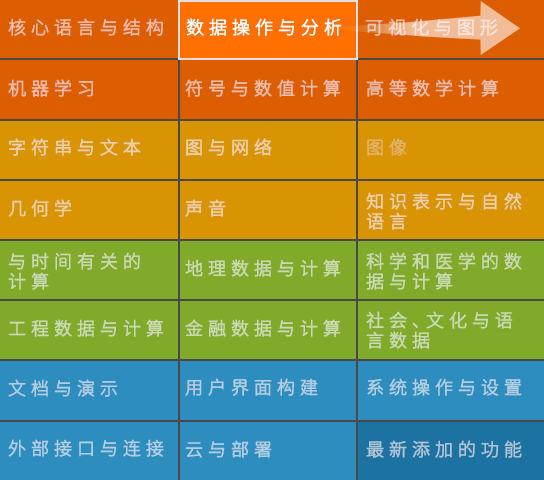Wolfram 表格数据处理是 Wolfram 语言的一个组成部分。整个系统包含了六千多个内置函数,涵盖了计算领域的方方面面,所有内容被精心集成在一起,相互支持,完美地结合为一个整体。