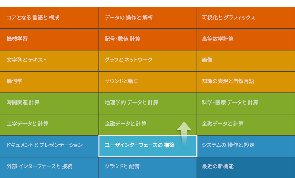 Wolfram ユーザインターフェースは,Wolfram言語に統合されています.全システムに計算の全分野を網羅する6,000個を超える組込み関数が含まれており,そのすべてが綿密に統合されているため,完全に一体となって作動します.