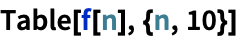 | Table[ f[n],{n,10}] | list of values of f[n] with n going up to 10 | |
