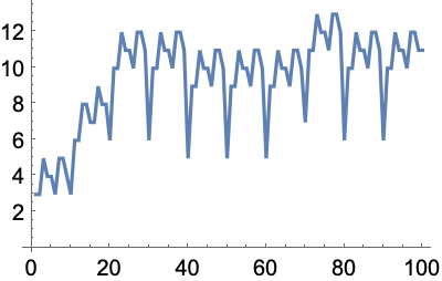 Plot the lengths of the Roman numerals for numbers up to 100:
