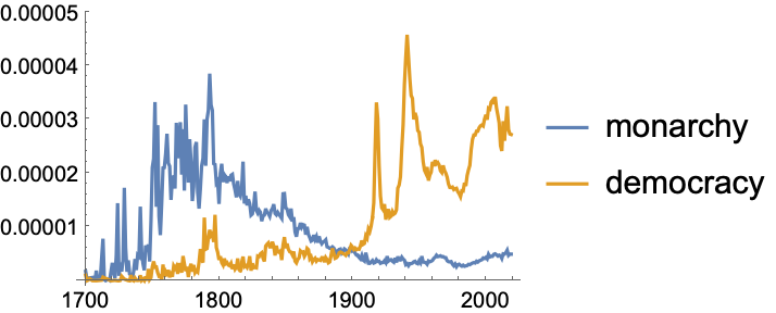 WordFrequencyData is set up to make it easy to compare frequencies of different words. Let’s see how “monarchy” and “democracy” have fared over the years. “Democracy” is definitely more popular now, but “monarchy” was more popular in the 1700s and 1800s.