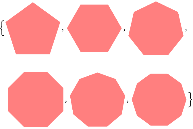 8.6Make a list giving the regular polygons with 5 through 10 sides, with each polygon being colored pink. »