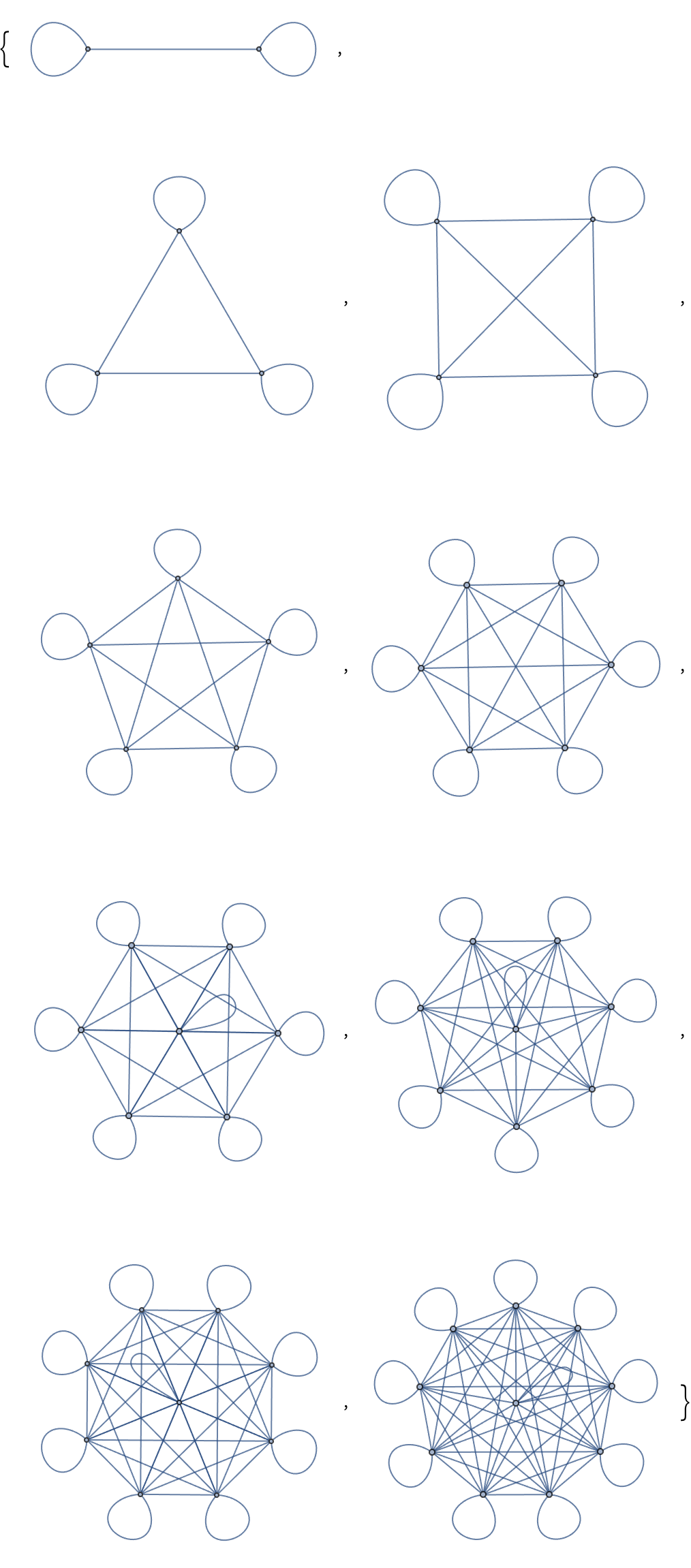 21.3Make a table of undirected graphs with between 2 and 10 nodes in which every node is connected. »