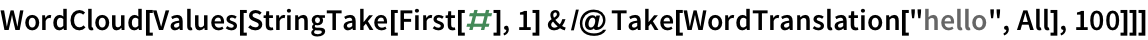 For the top 100 languages, make a word cloud of the first characters in the word for “hello”: