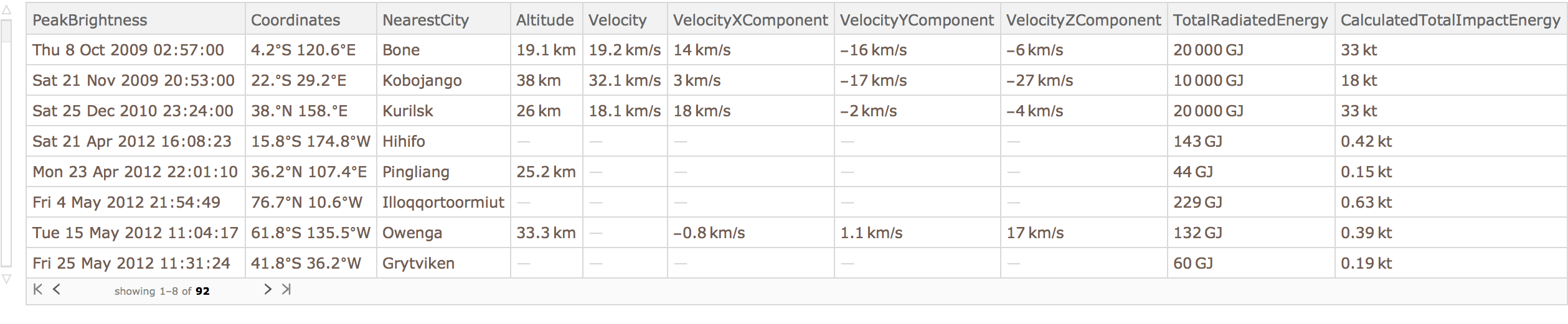 45.10Find a dataset of the 5 largest observed altitudes in the Fireballs & Bolides dataset.