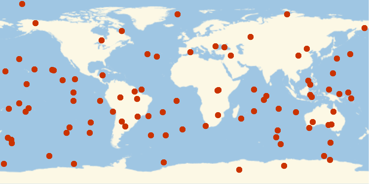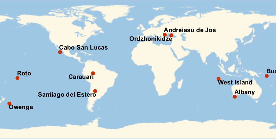 45.12Plot the nearest cities for the first 10 entries in the Fireballs & Bolides dataset, labeling each city.