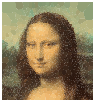Wenn Sie ein Bild als Eingabe verwenden, können Sie durch die wiederholte Anwendung von VoronoiMesh eine Darstellung des Bildes in Mosaik- oder Bleiglasfenster-Optik erzeugen.