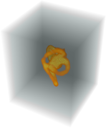 最大のコンポーネントを選んで蝸牛を抽出し,選ばれた部分にもとの立体を掛けてその部分を可視化する.